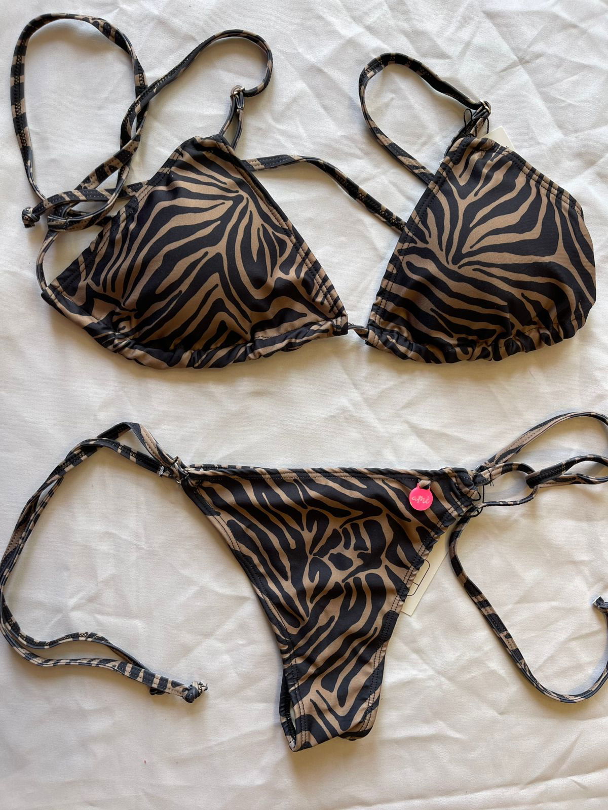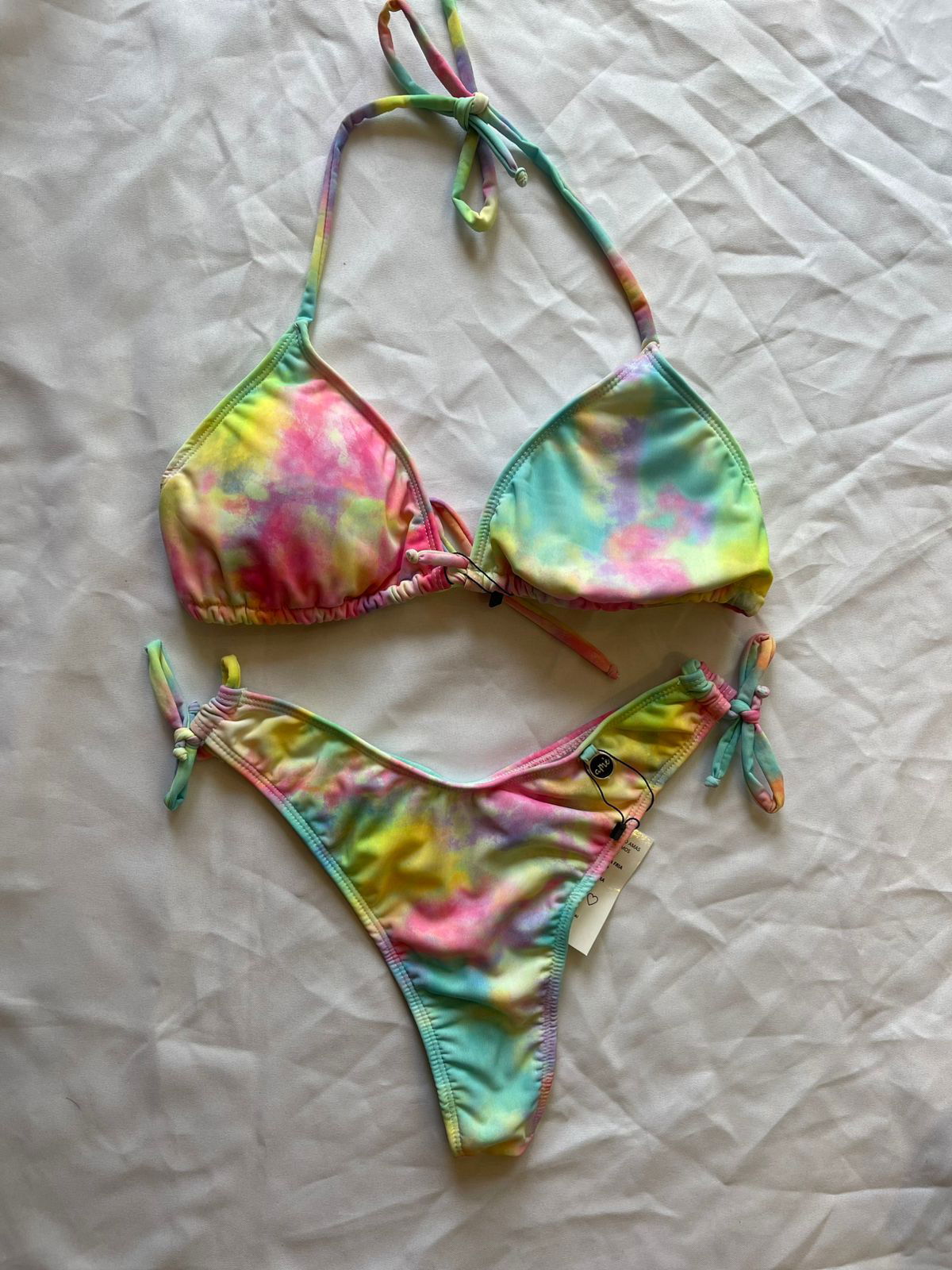 Corpiño triangulito corredizo con rellenitos desmontables, breteles regulables de elastico rasado y espalda para atar de tira extralarga para atarla como se prefiera. Bombacha colaless para atar