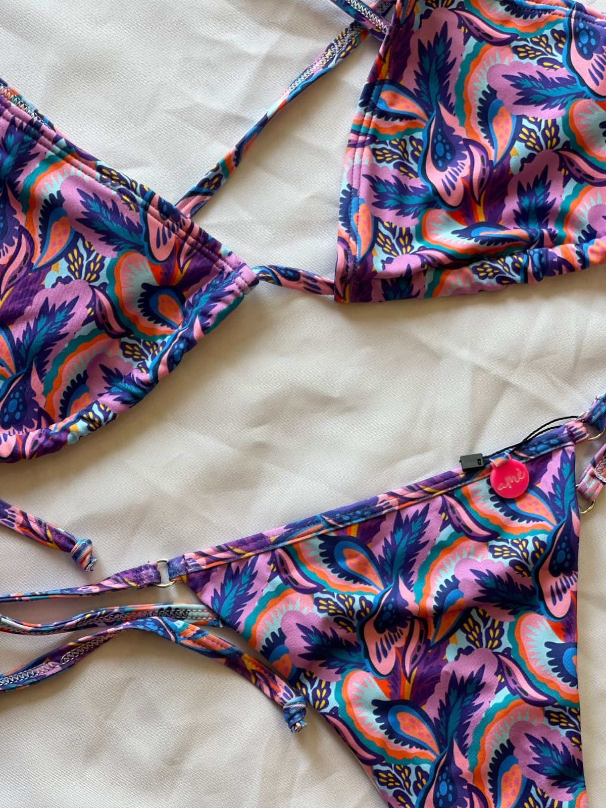 Corpiño triangulito corredizo con rellenitos desmontables, breteles regulables de elastico rasado y espalda para atar de tira extralarga para atarla como se prefiera. Bombacha colaless para atar